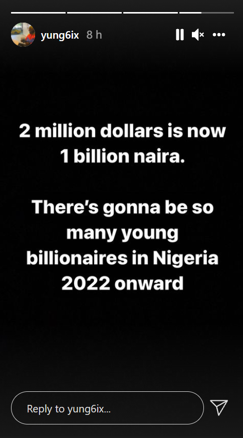 Rapper Yung6ix has pointed out that $2m is now N1 billion, going by the exchange rate currently obtainable in the market.