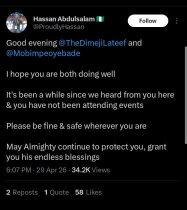 Several fans took to social media to express worry. One user, Ayomide_Koya, wrote that they hoped the couple were doing fine, noting their absence from both posts and events. Another fan, Hassan Abdulsalam, also sent a message wishing them well and asking for confirmation of their safety and wellbeing.
