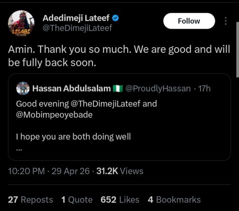 Responding to the concerns, Lateef reassured fans, saying, “Amin. Thank you so much. We are good and will be fully back soon.”