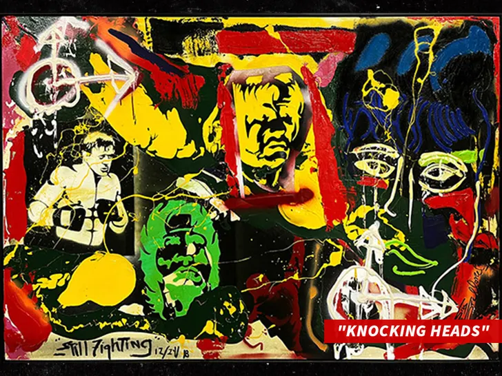 The event, held at The Wynn Hotel, featured Stallone and his family among the attendees. The actor brought along an original multicolored painting titled “Knocking Heads,” which includes vibrant greens, yellows, and reds, with thoughtful faces and a nod to his iconic character Rocky Balboa.