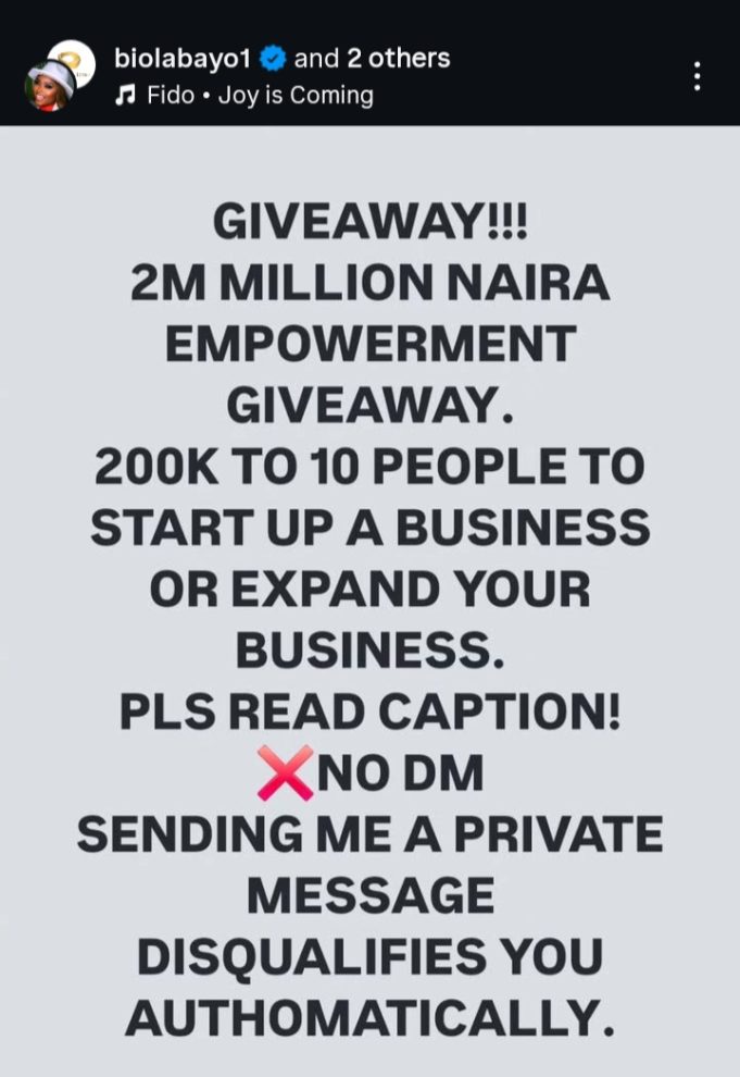 “GIVEAWAY!!! 2M MILLION NAIRA EMPOWERMENT GIVEAWAY. 200K TO 10 PEOPLE TO START UP A BUSINESS OR EXPAND YOUR BUSINESS. PLS READ CAPTION! PLSL READ CAPTION!”