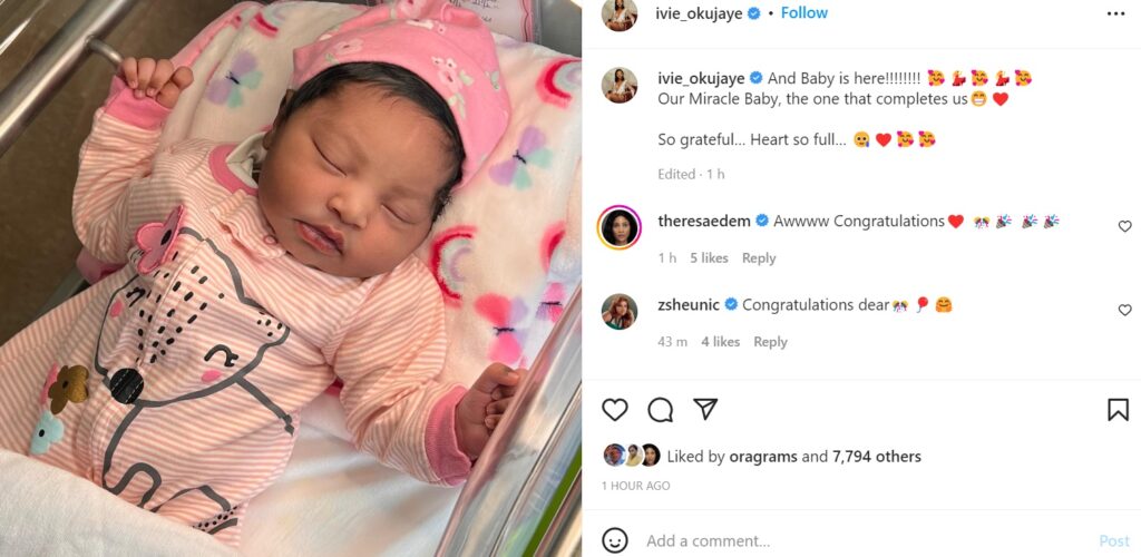 The actress excitedly shared the news on Instagram. Ivie who shared a photo of her new baby, revealed that she had a long labour.