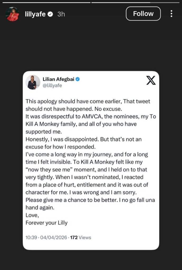 Lilian Afegbai has apologised for her recent social media outburst directed at the organisers of the Africa Magic Viewers’ Choice Awards (AMVCA).