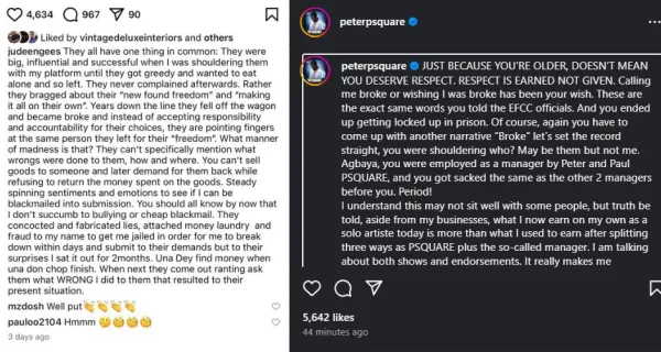 Peter called Jude out minutes ago on Instagram, after the music director fired shots at him and Cynthia Morgan.