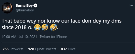 Burna Boy tweeted in Pidgin English, “That babe wey nor know our face don dey my dms since 2018 o. .”