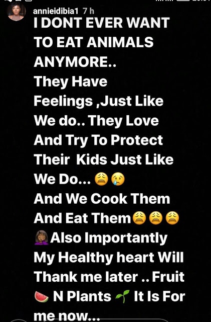 Annie Idibia has disclosed she won;t eat animals again because they have feelings just like we do. She made this known on her insta-story, saying for her, it is now fruits and plants henceforth.