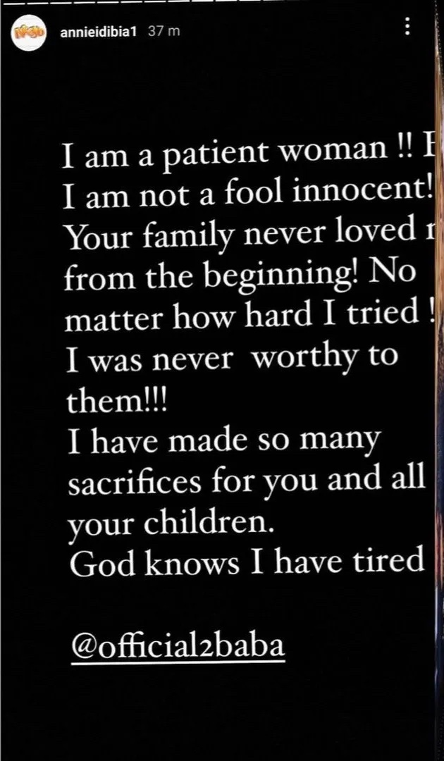 Annie in a post via her Instagram story on Thursday night accused her husband of always ganging up with his family members to do things that will bring public disgrace to her.