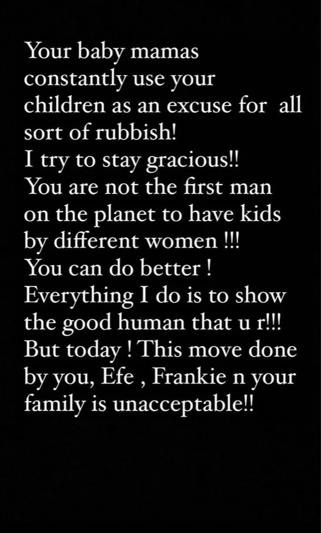 “I try to stay gracious, you are not the first man on planet to have kids by different women. Everything I do is to show the good human that I’m, but today this move you, Efe Frankie and your family took is unacceptable,” she wrote.