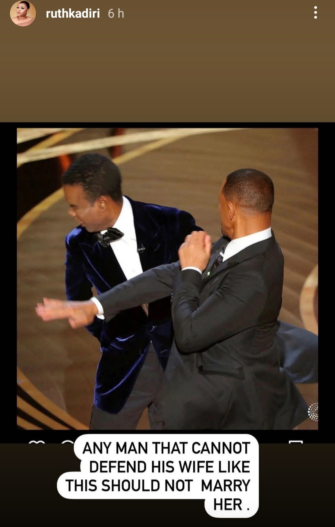 Ruth Kadiri-Ezerika has said that any man who cannot defend his wife life Will Smith did should not get married.