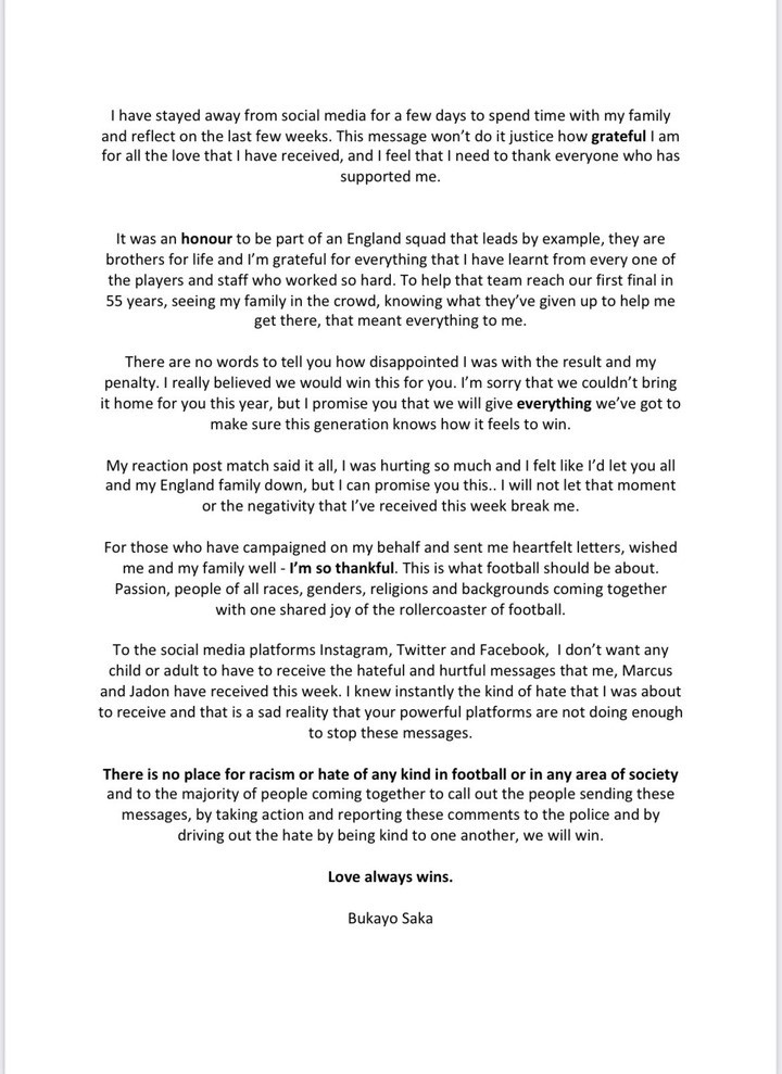 Saka has now broken his silence on the matter in an open, heartfelt message to all football fans.