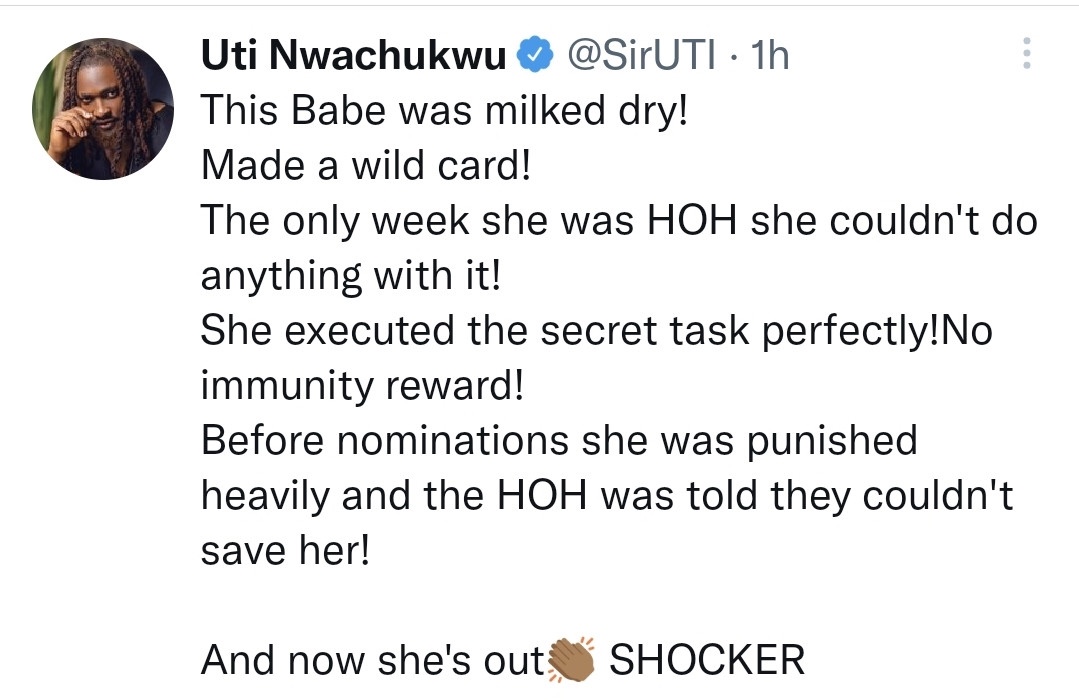 Media personality, Uti Nwachukwu, has joined several Big Brother Naija fans in the discussion about Maria’s shocking eviction from the reality TV show.