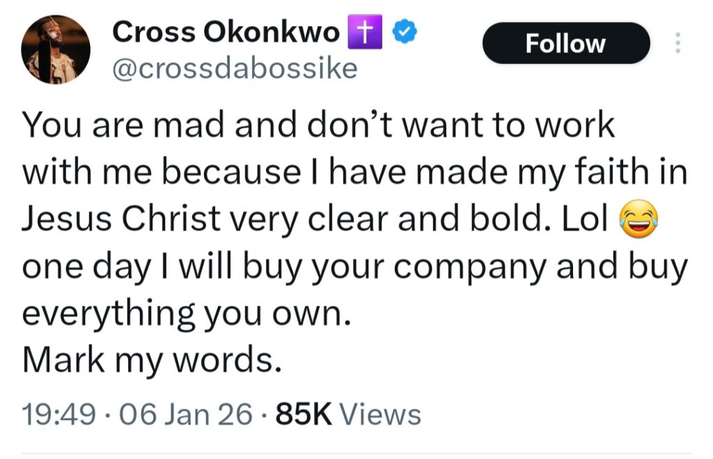 Cross Okonkwo, popularly known as Cross da Boss, has addressed an issue he is facing for being vocal about his religious beliefs.