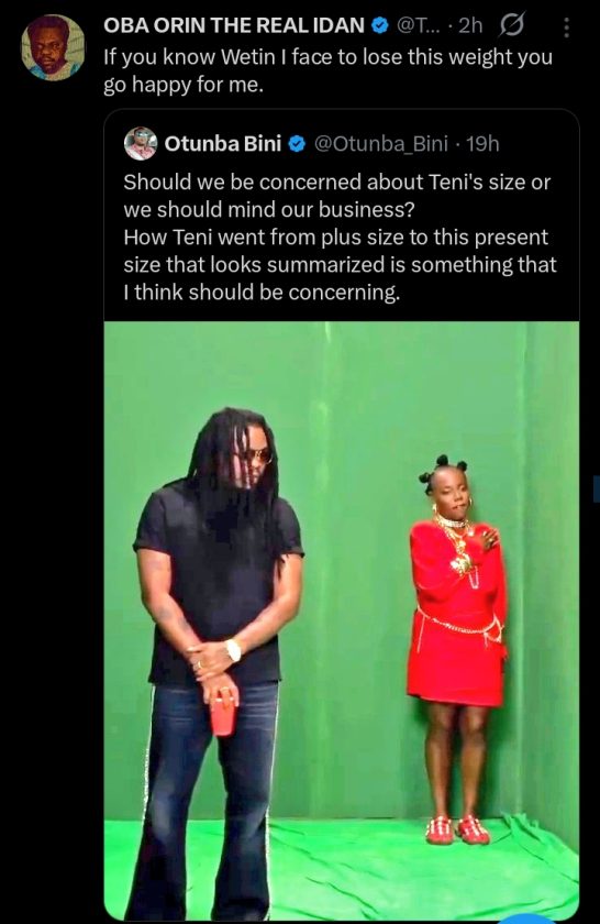 She said this while reacting to an X user who had raised concern over her noticeable weight loss. Teni and Olamide had featured in a music video, where her weight loss was very notable.