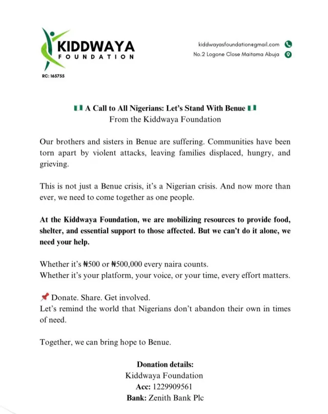 The appeal, made through the Kiddwaya Foundation, called on Nigerians to contribute “₦500 or ₦500,000” to provide food, shelter, and support for displaced families.