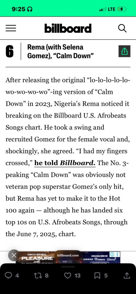 Billboard’s article noted that while the original version of Calm Down gained traction on the U.S. Afrobeats Songs chart, the remix with Gomez propelled it to mainstream success, peaking at No. 3 on the Hot 100. The magazine added that Rema has not returned to the Hot 100 since, although he recorded six top-10 entries on the U.S. Afrobeats Songs chart as of June 7, 2025.