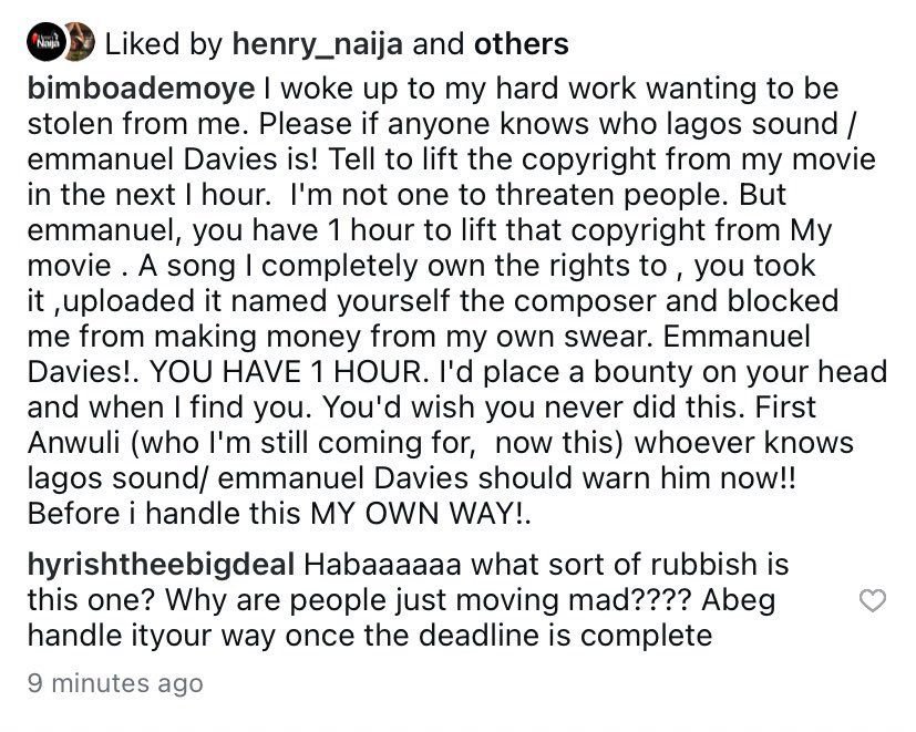 “I took down the other posts as advised by my management. For clarity , I woke up to monetization on our movie where love lives being taken down. A song I have full ownership of , a track I fully own with full approval from the artist was lifted and claimed by one emmanuel Davies. Not only did he steal MY SONG, he claimed copyrights and took monetization which means he’s claiming the money from the movie belongs to him .. I’m not an irresponsible person, i do not take what doesn’t belong to me, I do all my findings before uploading a movie. I pay for all the soundtracks I use in My movie. Why one person would wake up one day, steal my song and claim it to be his own, I don’t know. But this is me saying ,Emmanuel Davies, until I see you behind bars, I will not rest. I’d let the authorities do thier job. If anyone has any vital information on Emmanuel Davies pls send an email. Thank you.”