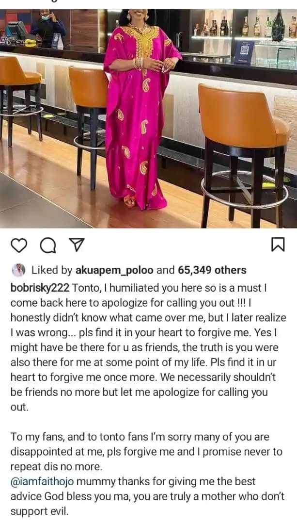 “Tonto I humiliated you here so is a must I apologise for calling you out. I honestly don’t know what came over me but I realize I’m wrong. Please find it in your heart to forgive me.