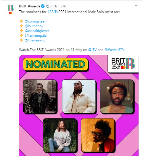Nigerian Grammy-award-winning singer, Burna Boy, has secured a back-to-back nomination in the International Male Solo Artist category of the 41st edition of the BRITs Awards.
