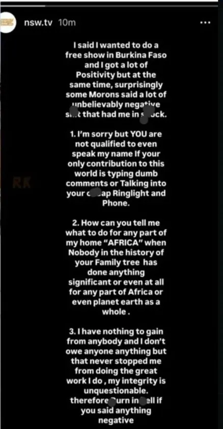 He wrote: “i said I wanted to do.a free show in Burkina Faso and I got a lot of Positivity but at the same time, surprisingly some Morons said a lot of «unbelievably negative shit that had me in shock.