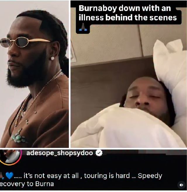 Media personality Adesope Shopsydoo shared the clip, showing Burna Boy lying down, and wished him a speedy recovery, saying touring is tough.