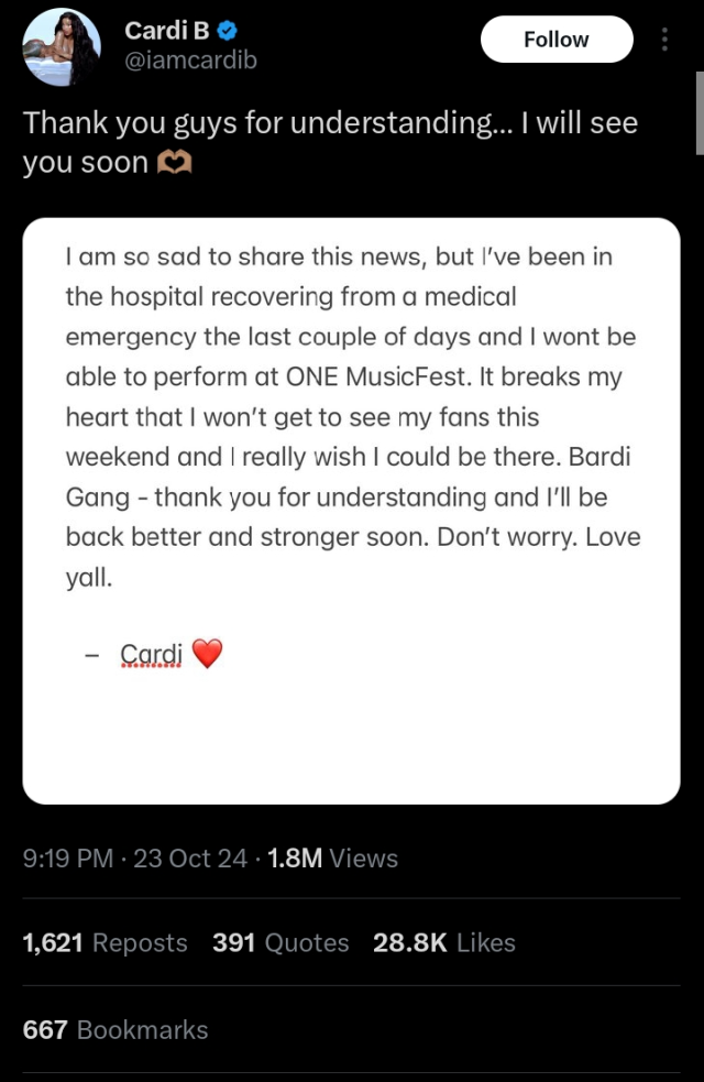 Cardi B has announced on social media that she’s been hospitalized for several days due to a medical emergency, forcing her to cancel her highly-anticipated performance at One Music Fest