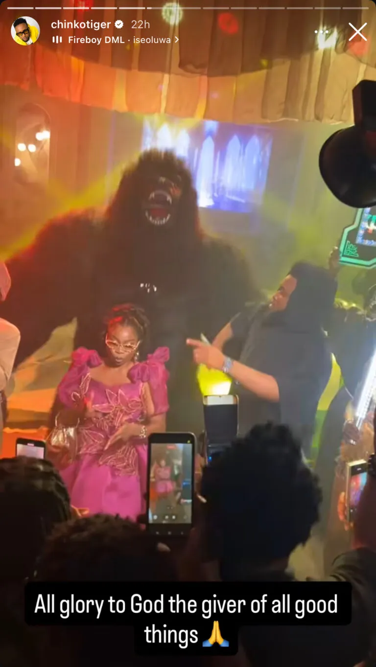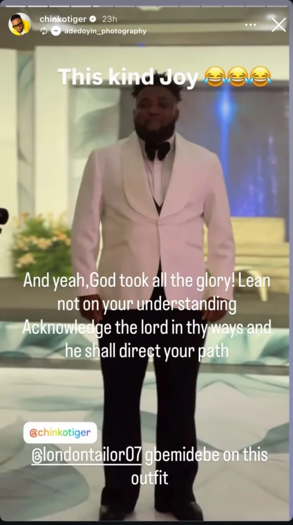 Ayemidun later changed into a beautiful pink gown and gold stone-rimmed glasses, captivating the attention of guests. In a heartfelt speech, Chinko Ekun expressed his joy and gratitude, saying, “This kind of joy… God took all the glory! Lean not on your understanding, acknowledge the Lord in thy ways, and He shall direct thy path.”