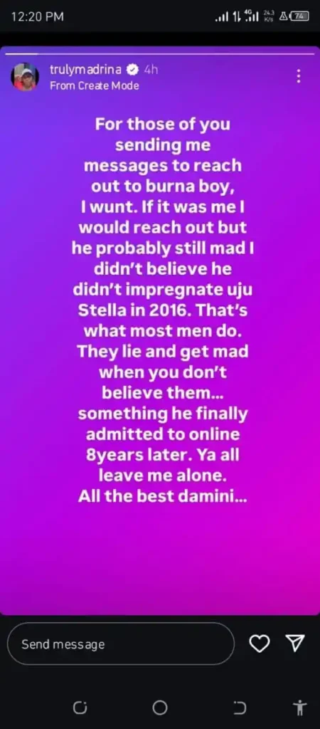 In an Instagram story, Madrina disclosed that she has no plans to reach out to Burna Boy, citing unresolved issues from the past.