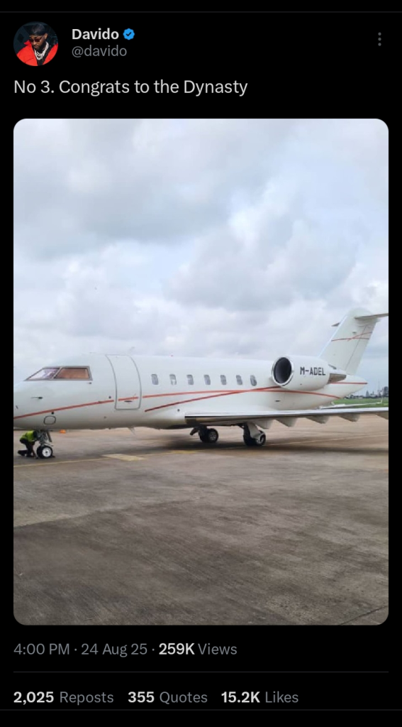 Sharing a photo of the aircraft on social media, the Afrobeats star proudly captioned it, “No 3. Congrats to the Dynasty,” signaling yet another addition to the family’s growing fleet.