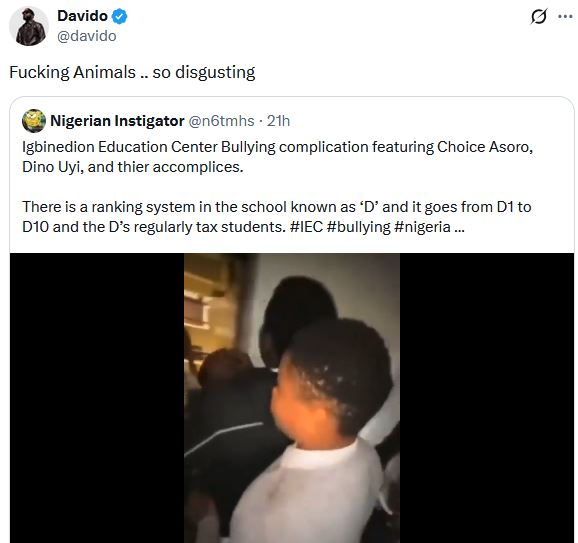 Davido has condemned a disturbing bullying incident at Igbinedion Secondary School in Edo State, calling the perpetrators “F#cking Animals”