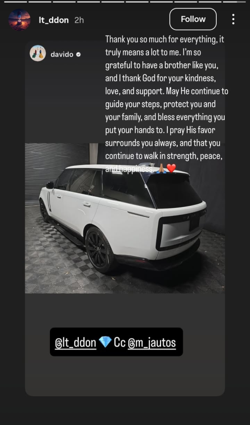 Lati, who has been by Davido’s side for years and is widely regarded as more of a brother than an employee, took to his Instagram story to share a photo of the SUV along with an emotional message of gratitude.