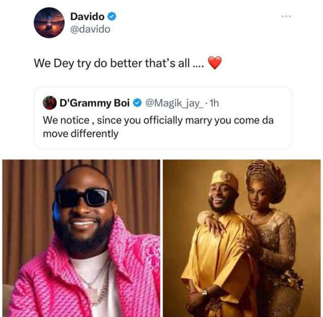 The fan tweeted, “We notice, since you officially got married, you’ve been moving differently.” Davido responded, “We dey try do better, that’s all.”