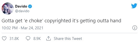 Davido has taken to his page on Twitter and has disclosed that he will be getting a copyright for the slang “E choke”.