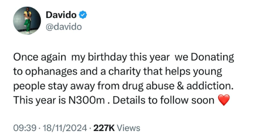 ‘’Once again my birthday this year we Donating to orphanages and a charity that helps young people stay away from drug abuse & addiction. This year is N300m . Details to follow soon ‘’
