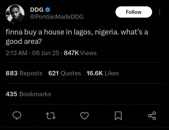US rapper DDG has announced plans to buy a house in Lagos, Nigeria, despite his ongoing child custody battle with ex-girlfriend Halle Bailey.