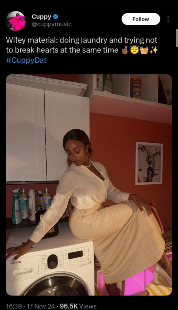 Alongside a photo of herself beside a washing machine, she tweeted: “Wifey material: doing laundry and trying not to break hearts at the same time #CuppyDat.”