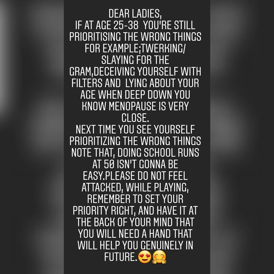 “Dear ladies, if at age 25-38, you are still prioritising the wrong things, for example, twerking, slaying for the gram, deceiving yourself with filter and lying about your age when deep down you know menopause is very close,” she said “Next time you see yourself prioritising the wrong things, doing school runs at 50 isn’t gonna be easy.