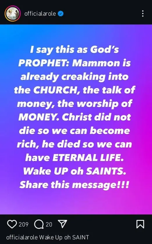 In a fresh Instagram post, Arole lamented that the church is shifting its focus from spiritual growth to financial gain.