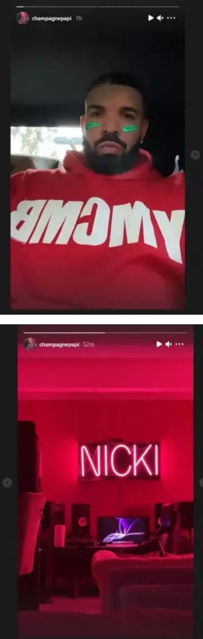 Meanwhile, Drake returned to his Instagram Story where he first showed himself inside of a vehicle rocking a YMCMB sweatshirt before switching gears and revealing he was in the studio with Minaj.