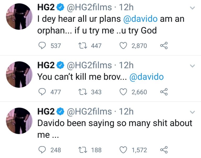 Shortly after making the call out, HG2 deleted the tweets back then. Now he is making another accusation saying he has heard Davido’s plans of trying to kill him and he just wanted to tell him if he dares tries him, he will be trying God because he is an orphan.