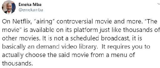 Mba reacted to this on Twitter, saying that the planet has some bad people living in it will not make others vacate earth. He also emphasized one would have to request to watch the movie just like any other movie on Netflix and so, it’s not bad as it is been said.