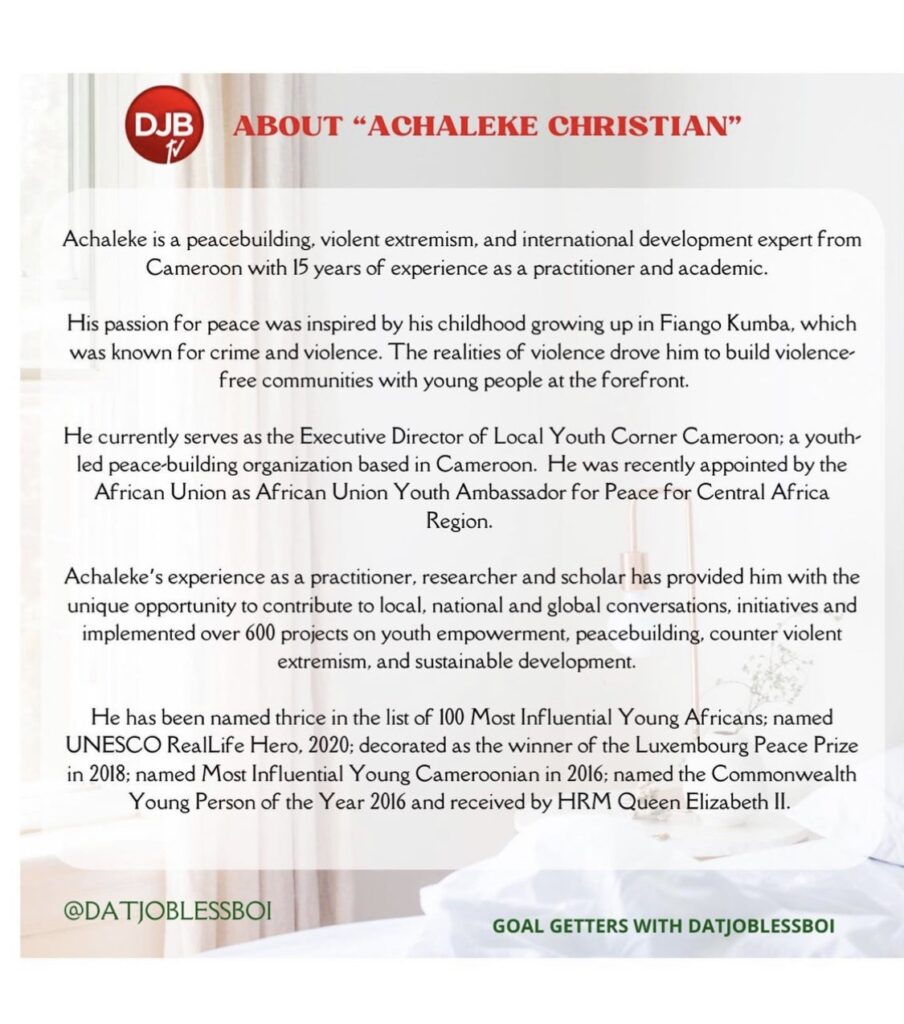 The next edition of “GOAL GETTERS WITH DATJOBLESSBOI” on DJBTV will feature our guest speaker, ACHALEKE CHRISTIAN from CAMEROON 🇨🇲 🇨🇲 🇨🇲 (Executive Director, Local Youth Corner , Cameroon).