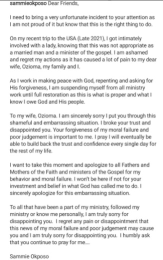 On my recent trip to the USA (Late 2021), I got intimately involved with a lady, knowing that this was not appropriate as a married man and a minister of the gospel. I am ashamed and regret my actions as it has caused a lot of pain to my dear wife, Ozioma, my family and I.