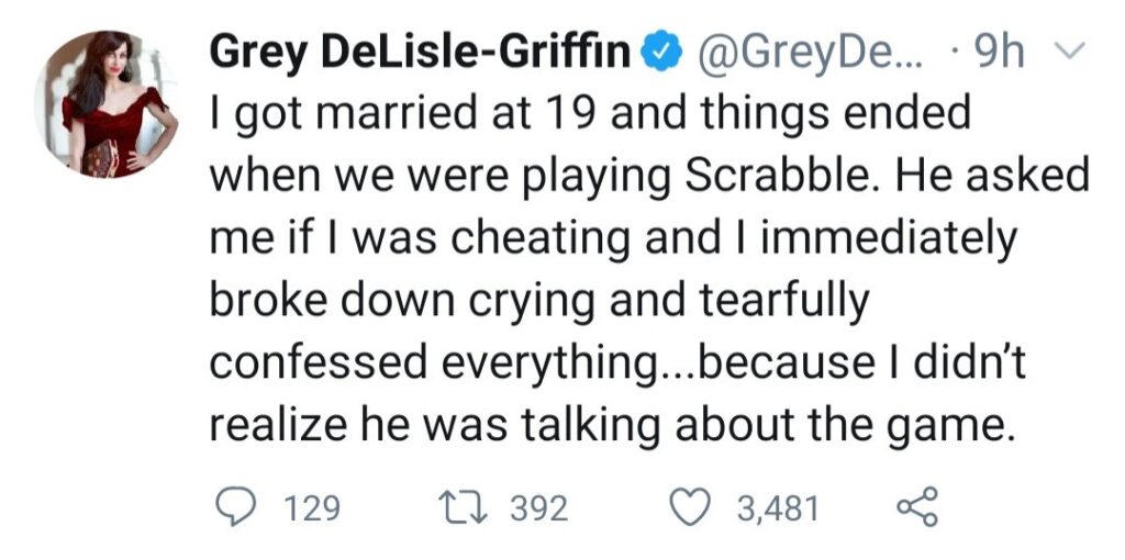 She wrote: “I got married at 19 and things ended when we were playing Scrabble. He asked me if I was cheating and I immediately broke down crying and tearfully confessed everything…because I didn’t realize he was talking about the game.”