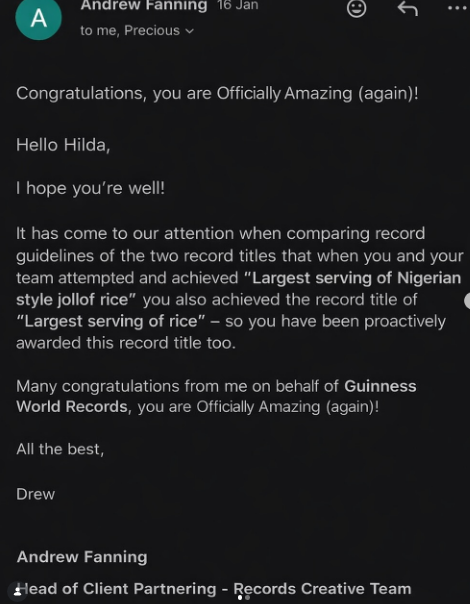 According to Hilda on Instagram, she received the news, confirming that her jollof rice feat had broken not one, but two records: largest serving of Nigerian-style jollof rice and largest serving of rice overall.