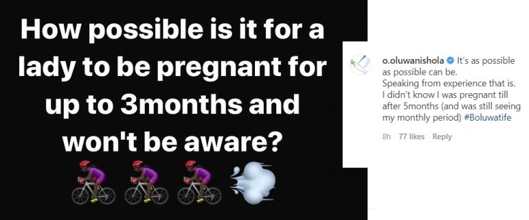 I didn’t know I was pregnant till after 5months (and was still seeing my monthly period) #Boluwatife”.