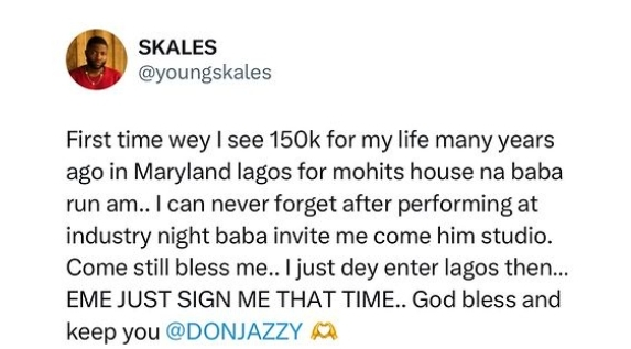 Popular artist Skales, joined others in praising Mavin Records boss, Don Jazzy for his generosity.