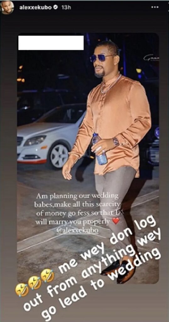 Alex then responded to her, saying that is far from his plans now, as wedding si the last thing on his mind.