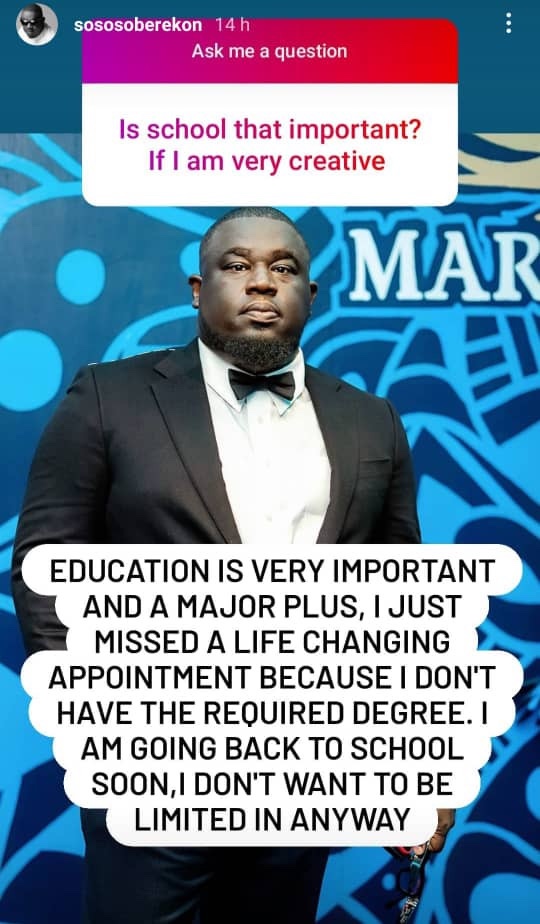 Music executive, Sososoberekon, has taken to his Instagram page to harp on the importance of education. He took to his Instagram page to reveal that he just lost a life-changing appointment because he doesn’t have the required degree. A fan had asked him during a question-and-answer session if school is important for creatives. Responding, Sososoberekon said