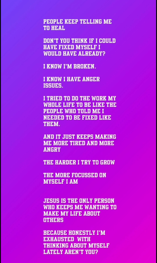He confessed to feeling broken, overwhelmed by anger, and exhausted from trying to meet others’ expectations of personal growth.