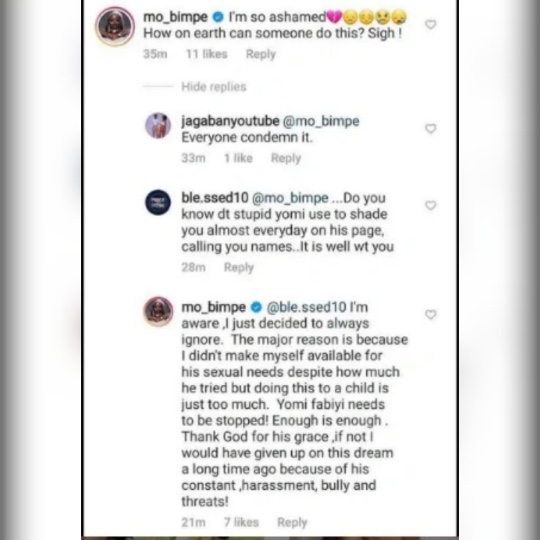 Reacting to Bimpe’s comment, an Instagram user referred to how Yomi Fabiyi consistently shades the actress on his social media page and calling her unprintable names.